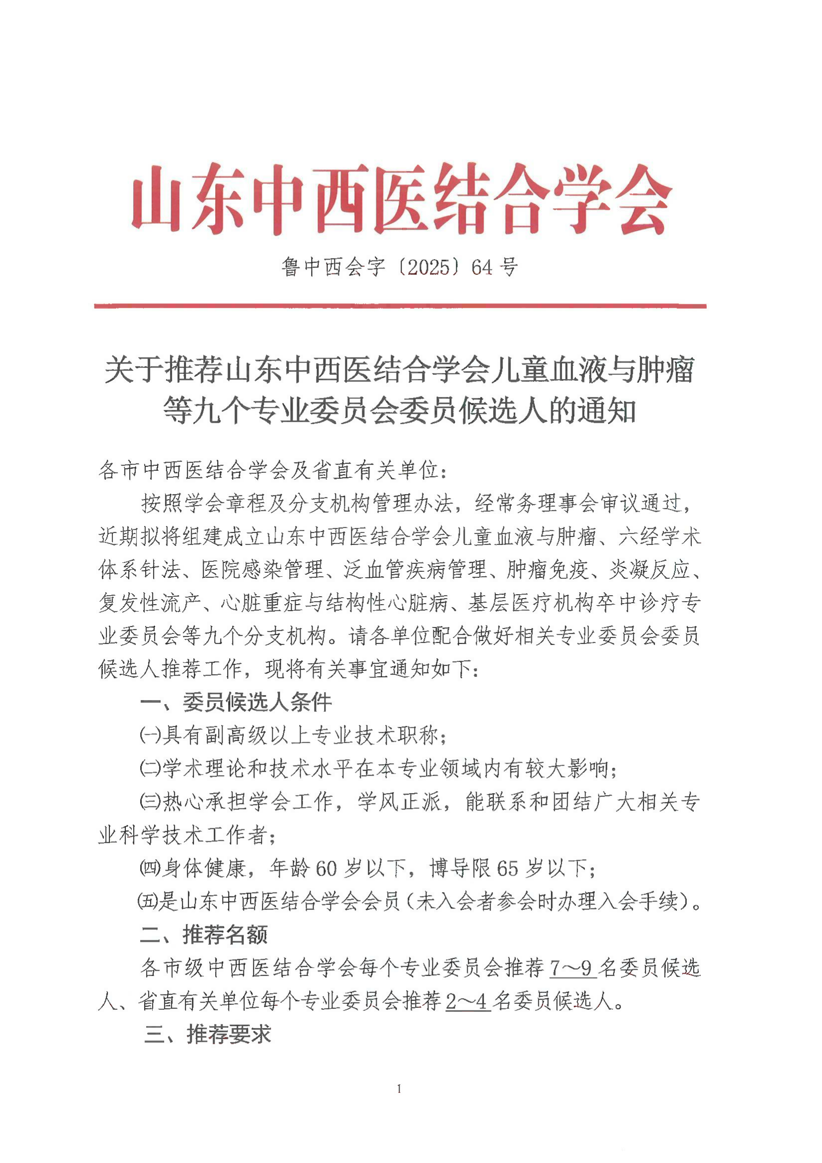 关于推荐山东中西医结合学会儿童血液与肿瘤等九个专业委员会委员候选人的通知 发布时间: 2025-05-23 11:03:20 浏览次数: 104 202564中西会-委员推荐及会议征文事宜(第一批).doc