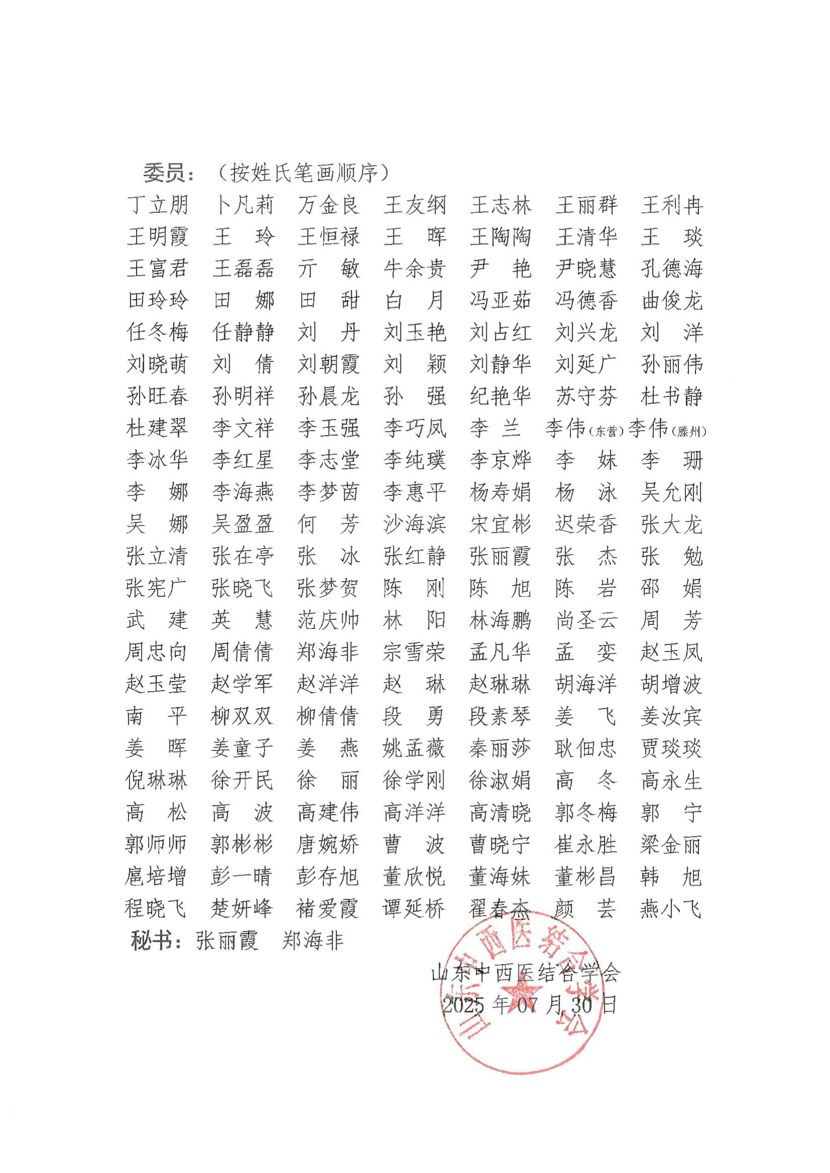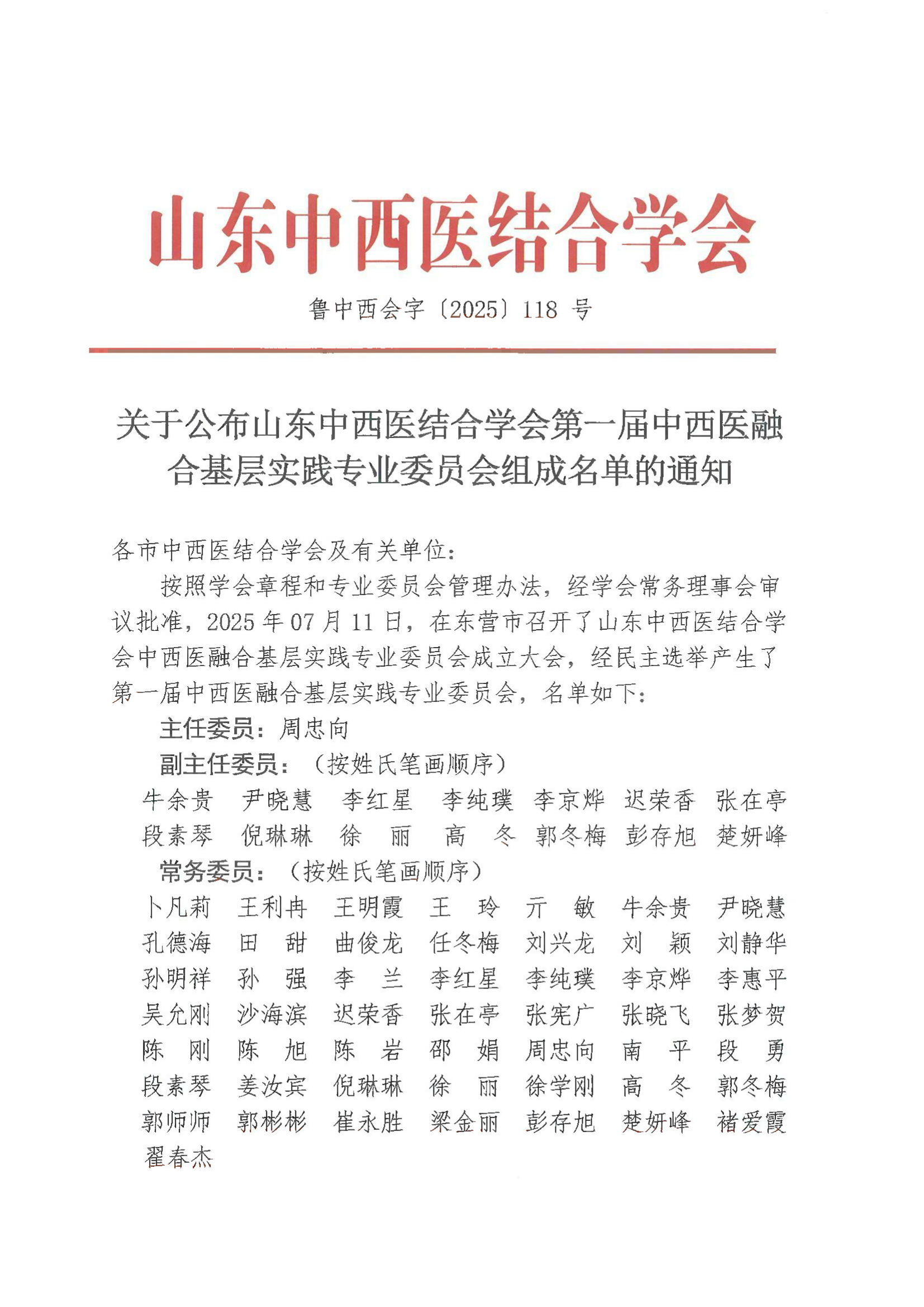 关于公布山东中西医结合学会第一届中西医融合基层实践专业委员会组成名单的通知 发布时间: 2025-08-08 10:45:28 浏览次数: 9 2025118中西会委员组成名单-中西医融合基层实践专委会.pdf