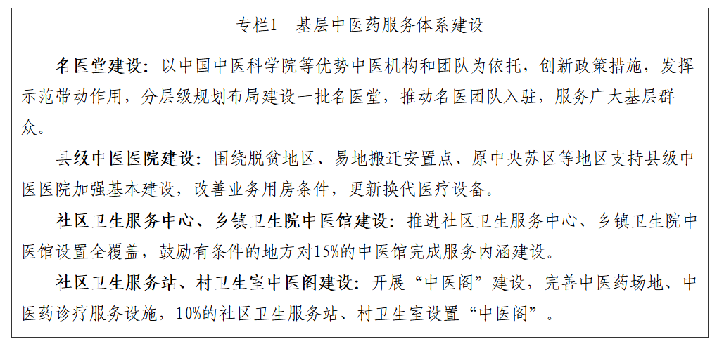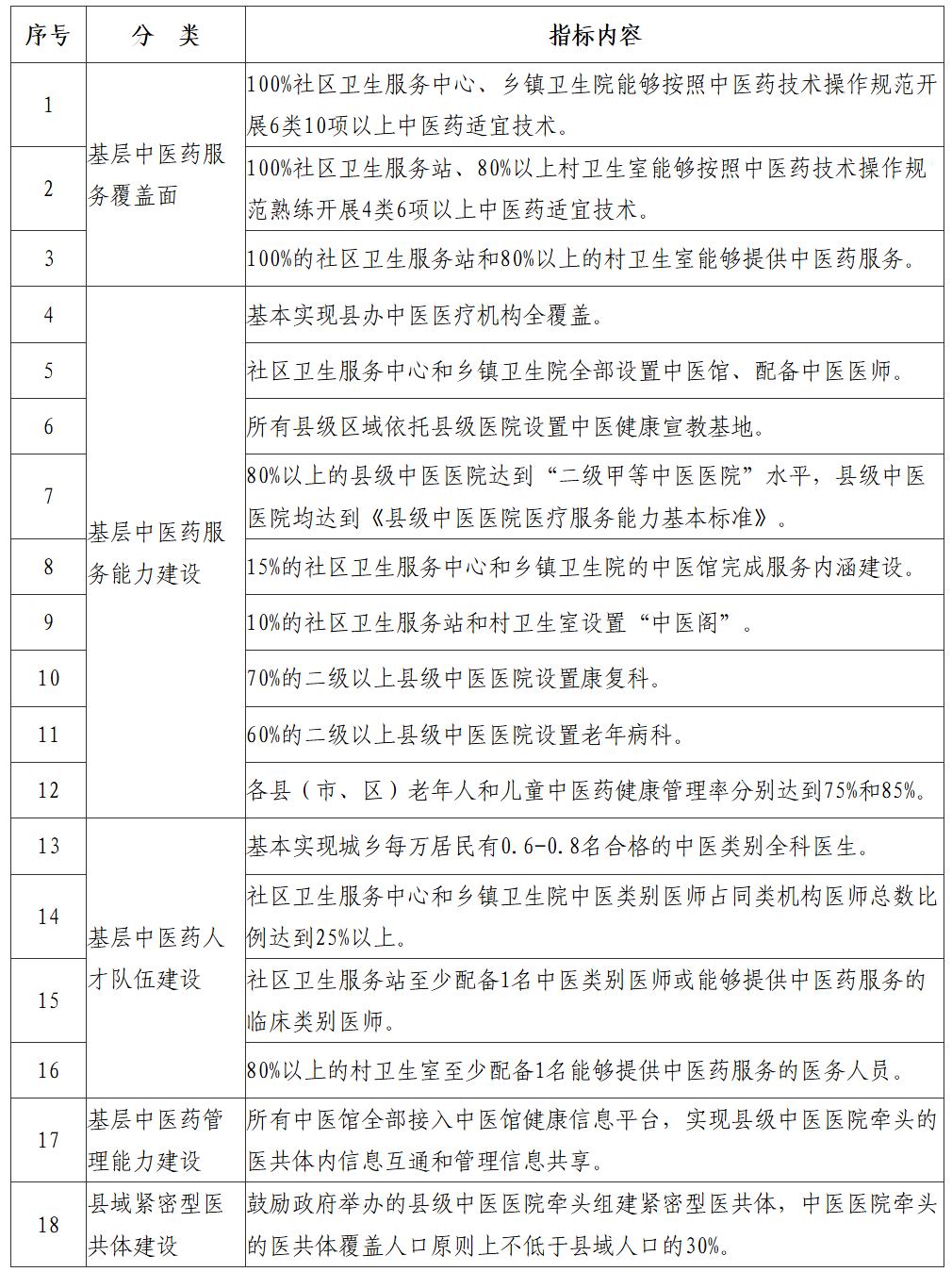 ——基层中医药服务提供基本实现全覆盖,100%社区卫生服务中心、乡镇卫生院能够规范开展10项以上中医药适宜技术,100%社区卫生服务站、80%以上村卫生室能够规范开展6项以上中医药适宜技术;