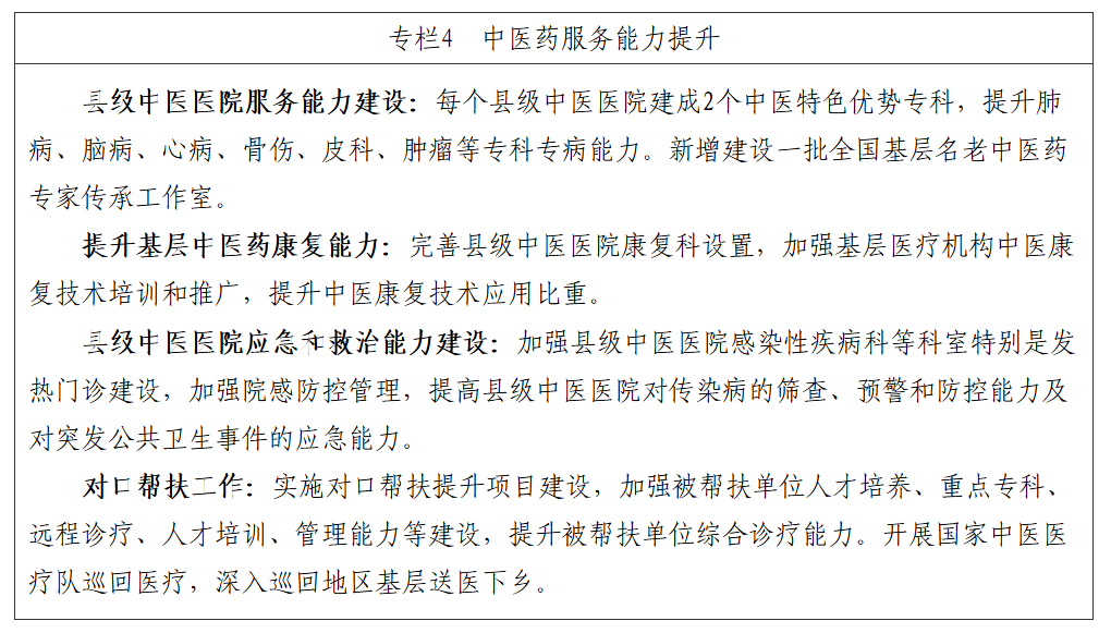 1.发挥县级中医医院龙头带动作用。落实《中华人民共和国中医药法》和《中共中央 国务院关于促进中医药传承创新发展的意见》要求,原则上每个县办好一所县级中医类医院,有效承担县域居民常见病、多发病中医诊疗和急危重症抢救与疑难病转诊任务。支持县级中医医院能力建设,提升县级综合医院、专科医院、妇幼保健机构中医药服务设施配置,中医临床科室、中药房、煎药室设置达到医院中药房、医疗机构中药煎药室等国家标准,鼓励县级妇幼保健机构设置中医妇科、中医儿科。