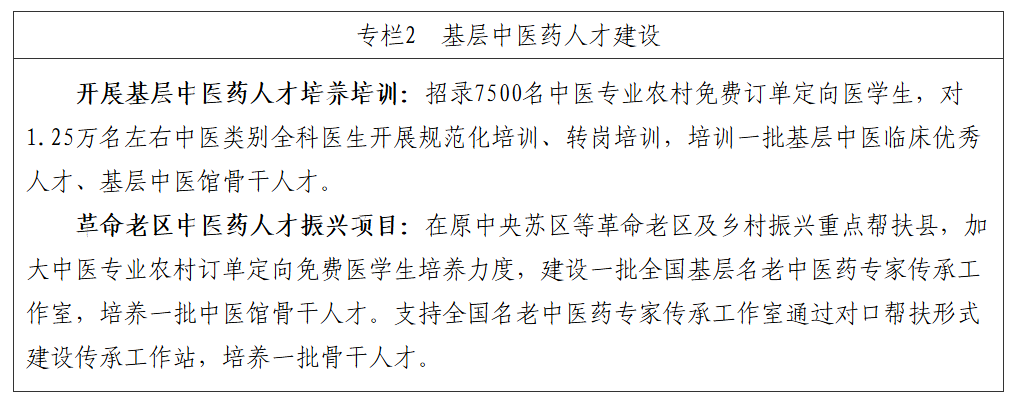 4.扩大基层中医药人才有效供给。根据需求合理确定本科层次中医专业农村订单定向免费医学生培养规模,持续开展中医类别全科医生规范化培训、助理全科医生培训、转岗培训等,鼓励开展专科层次农村订单定向免费医学生培养,为基层培养一批高素质中医药人才。开展基层西医学习中医人才培养和培训,鼓励西学中人员开展中医药服务。对现有基层中医药人员通过岗位培训、外出进修、跟师学习等方式,提高岗位技能和服务能力。鼓励退休中医医师和中医医术确有专长医师到基层执业服务。