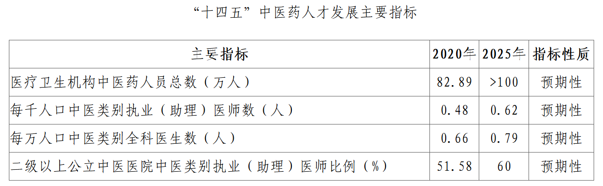 到2025年,符合中医药特点的中医药人才发展体制机制更加完善,培养、评价体系更加合理,人才规模快速增长,结构布局更趋合理,成长环境明显优化,培养和造就一支高素质中医药人才队伍,为中医药振兴发展提供更加坚强的人才支撑。