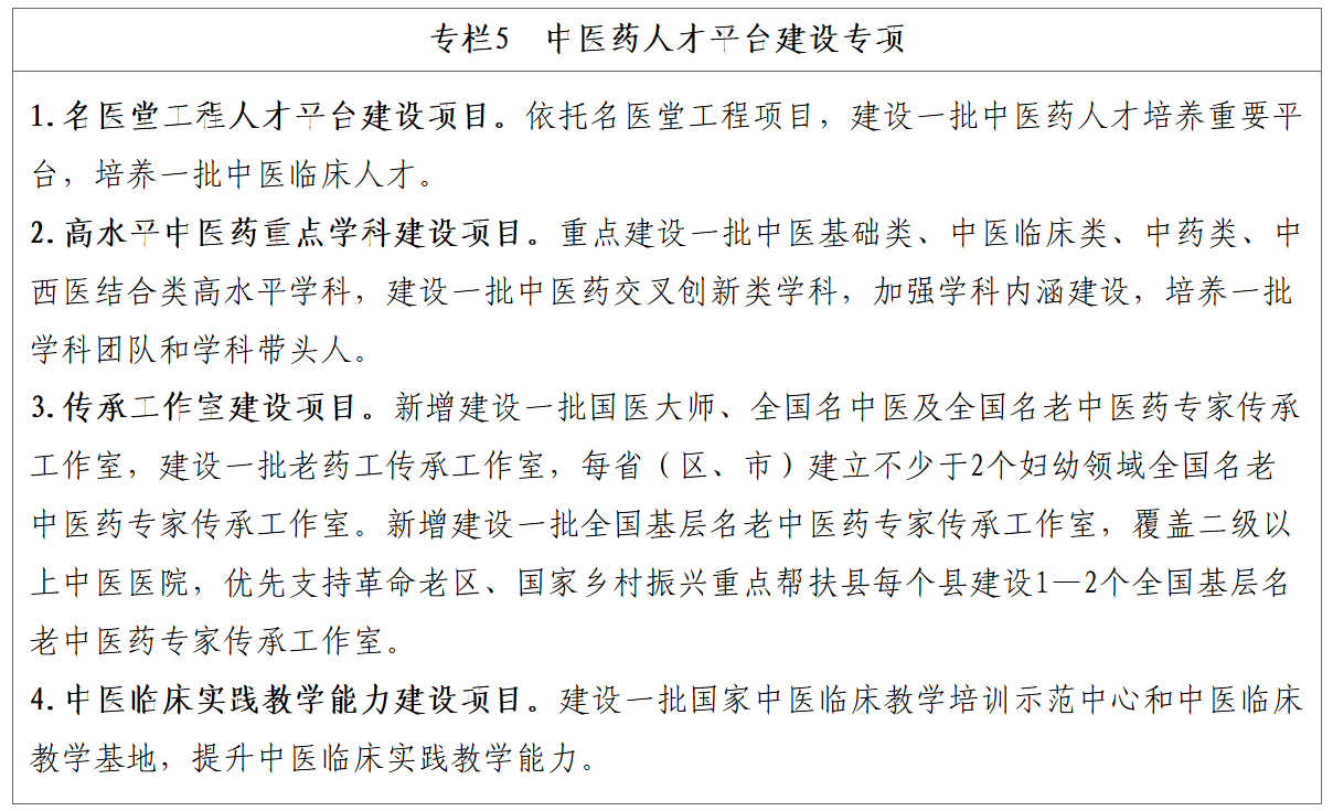 (一)建设中医药人才发展高地。围绕国家区域发展重大战略,支持京津冀、长三角、粤港澳大湾区等重大战略区域以及国家中医药综合改革示范区,整合区域内中医药教育、医疗、科研、产业等资源,强化资源共享和协同协作,打造中医药人才发展高地,形成“三区多点”的中医药人才发展高地格局。强化国家中医医学中心、区域中医医疗中心、中医药传承创新工程等重大平台对高水平临床、科研人才的培育功能。持续推进中医药高层次人才培养基地等中医药高层次人才培养平台建设。依托名医堂工程项目,建设一批中医药人才培养重要平台。