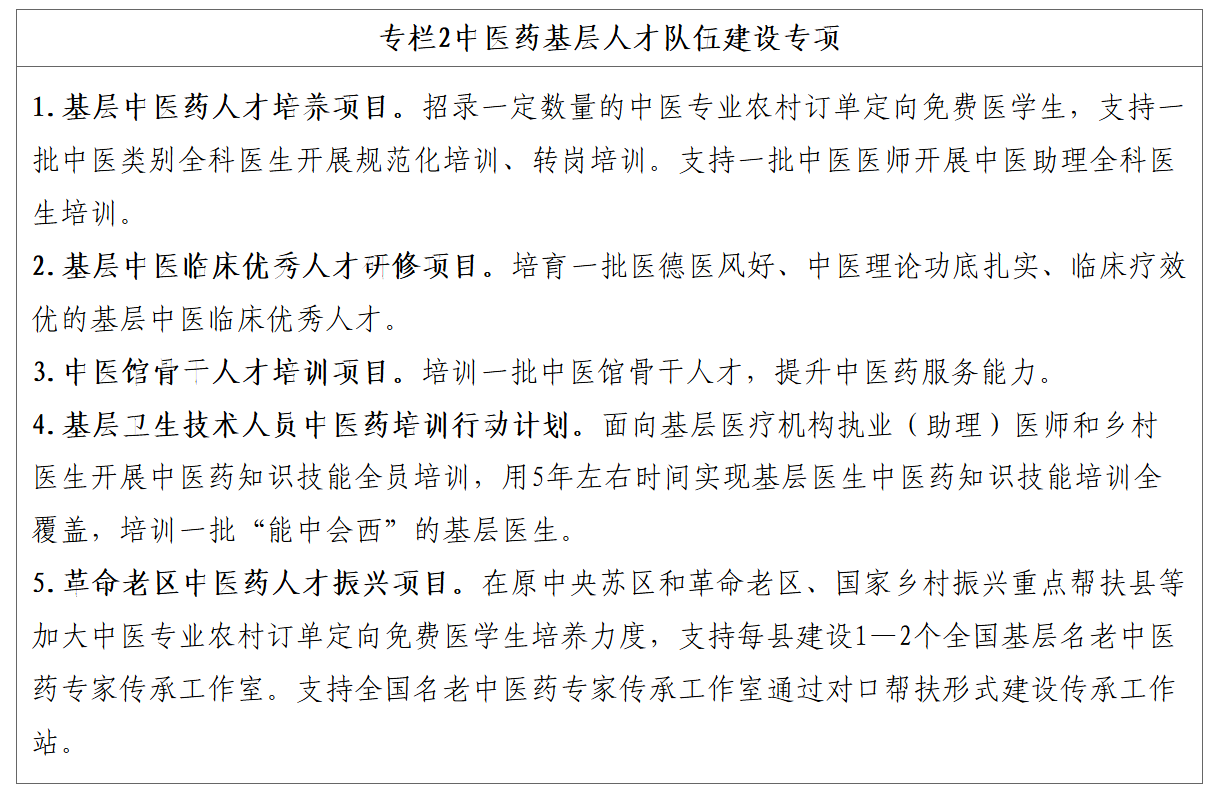 (一)加大基层人才供给力度。以全部社区卫生服务中心和乡镇卫生院设置中医馆、配备中医医师为目标,有针对性地加大基层中医药人才供给。持续实施中医全科医生规范化培训和助理全科医生培训、转岗培训。在全科医生特岗计划中积极招收中医医师,鼓励退休中医医师在基层执业。支持确有专长医师到乡镇卫生院、社区卫生服务站等基层医疗机构开展服务。鼓励中医医师通过项目合作等方式到农村和基层短期执业,鼓励符合条件的中医医师在社区和乡村开办中医诊所。逐步扩大本科层次中医专业农村订单定向免费培养医学生规模,支持地方开展高职层次中医专业农村订单定向免费医学生培养。推广“县管乡用”“乡管村用”等人才管理模式。加强中医药院校毕业生基层就业政策宣贯引导,提高毕业生下沉基层服务意愿。