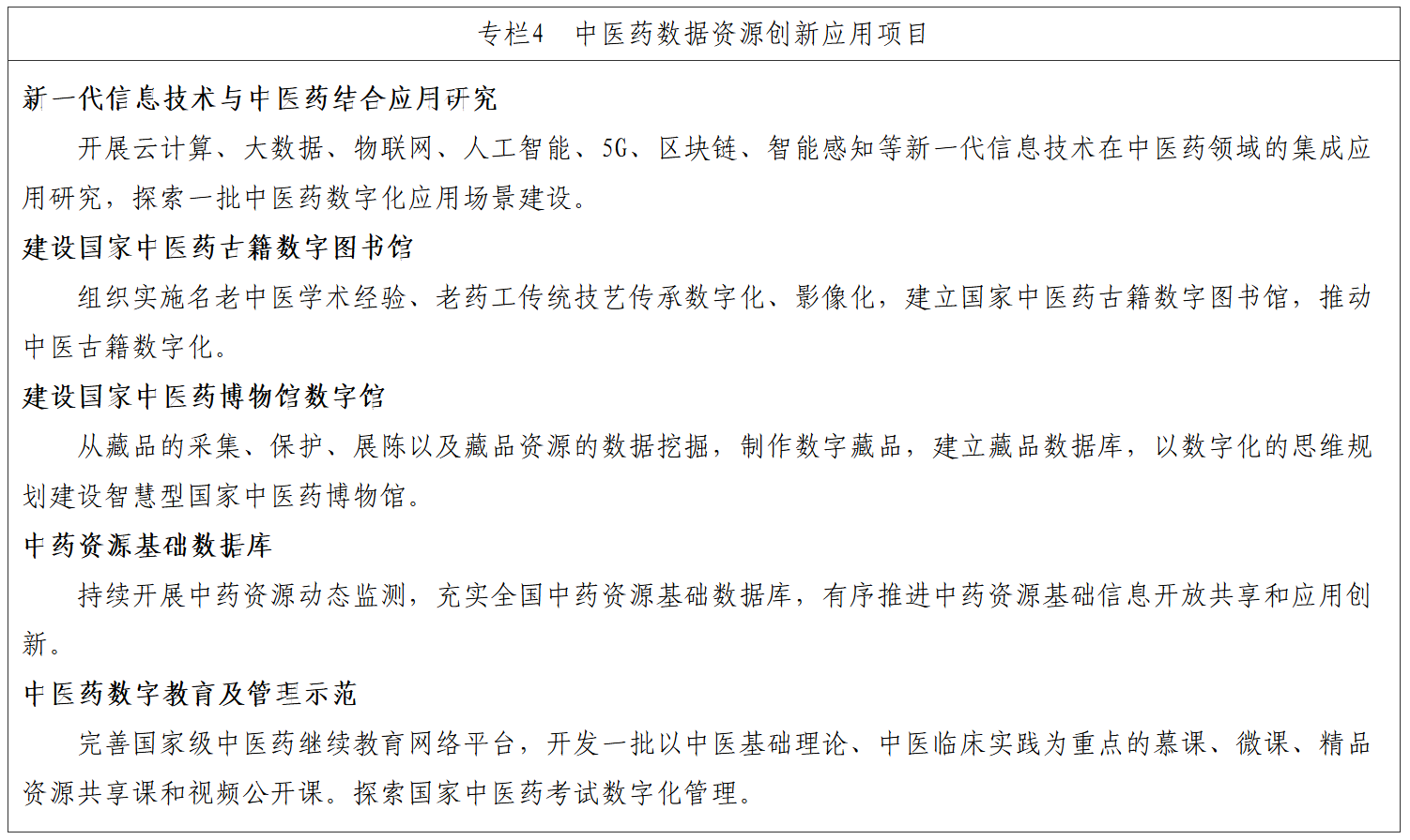 4.推动中医药文化数字化建设。鼓励中医药机构将中医药文化资源数据采集、加工、挖掘与数据服务纳入经常性工作。加强中医药领域数字出版、文化资源库、数字文化传播平台等建设,增强中医药数字内容的供给能力。加强网络原创优质内容建设,丰富中医药数字化文化产品创制,推动搭建数字化文化体验的线下场景,扩大中医药文化资源的开放范围。