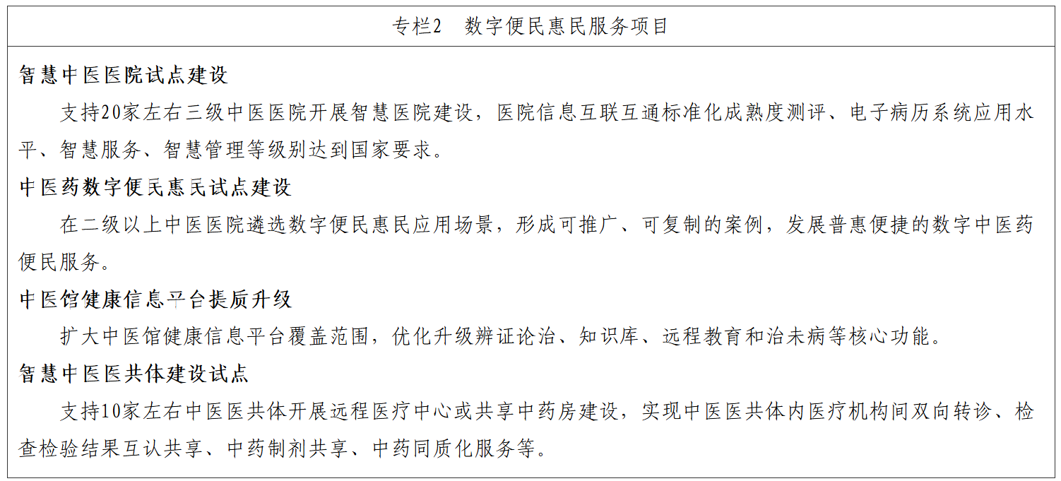 1.加强中医医院智慧化建设。将信息化作为医院基本建设的优先领域,鼓励各地开展智慧中医医院建设,探索建立首席信息官制度,推进医疗业务协同、激活数据要素价值、实现精准决策,建成一批电子病历、智慧服务、智慧管理一体化的具有示范引领作用的智慧中医医院。鼓励各地研发应用中医电子病历、名老中医传承信息系统、中医智能辅助诊疗系统等中医药特色系统,推广智慧中药房等服务模式。加强中医医院数据质量体系建设,构建中医医院主数据管理系统,强化中医病案首页数据质量控制。推动各地加大对县级中医医院信息化支持力度,建设以医院管理和中医电子病历为重点的医院信息系统,涵盖便民服务、医疗服务、医疗管理、运营管理等功能,实现临床诊疗与患者服务的有机衔接,推进通用信息系统开发及试点应用。
